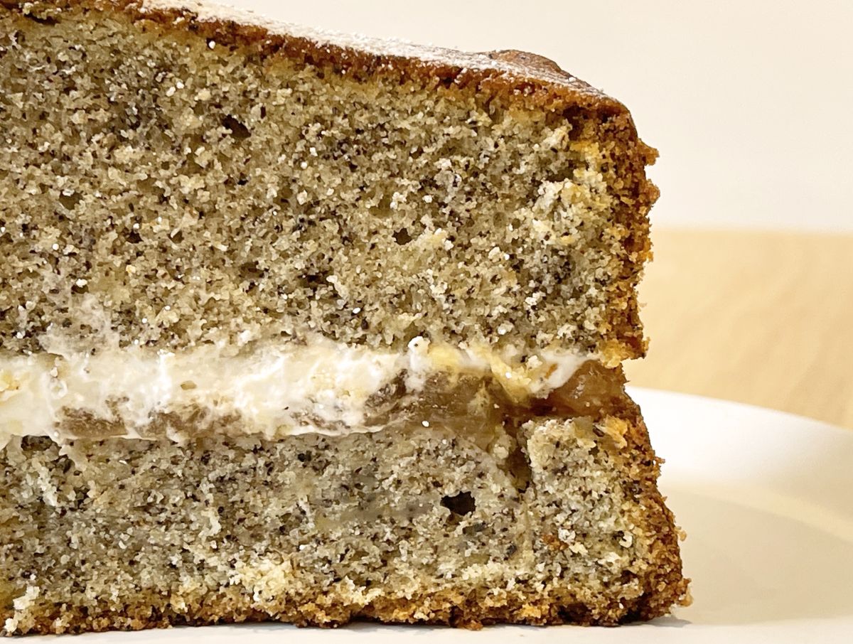 紅茶の茶葉を練り込んだケーキ生地で、りんごジャムとヨーグルト風味のクリームをサンド。