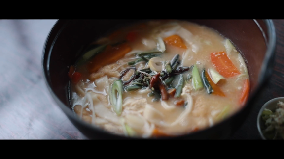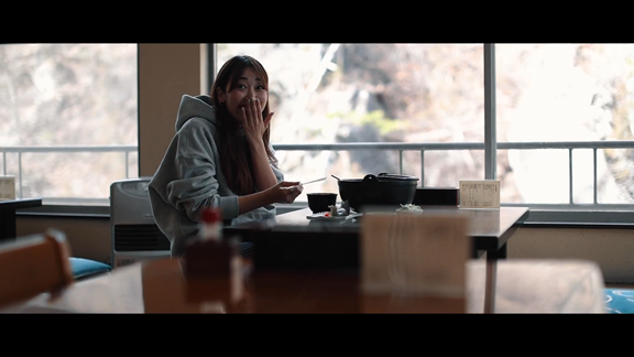昇仙峡のふもとにあるお食事処「渓水館(けいすいかん)」では、御岳そばや郷土料理のほうとう、岩魚定食などが味わえます。Enaさんが頼んだのは、山菜がたっぷり入った熱々の「ほうとう」。すでに見た目が美味しそう! 鍋が運ばれてきた時点で大興奮だったEnaさん、ひと口食べてこの表情です♪ 本場のほうとう、食べに行きたくなっちゃいますね。