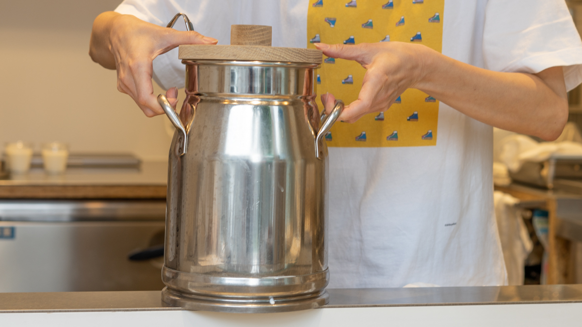 牧場から取り寄せたフレッシュな牛乳が入っている大きなミルク缶。充慶さんが実際に牧場で味わったなかから、月替りで3種類ほどを厳選して提供しています。牛の品種や与えているエサ、育て方、製造方法により味わいはさまざま。