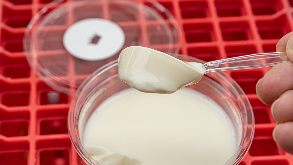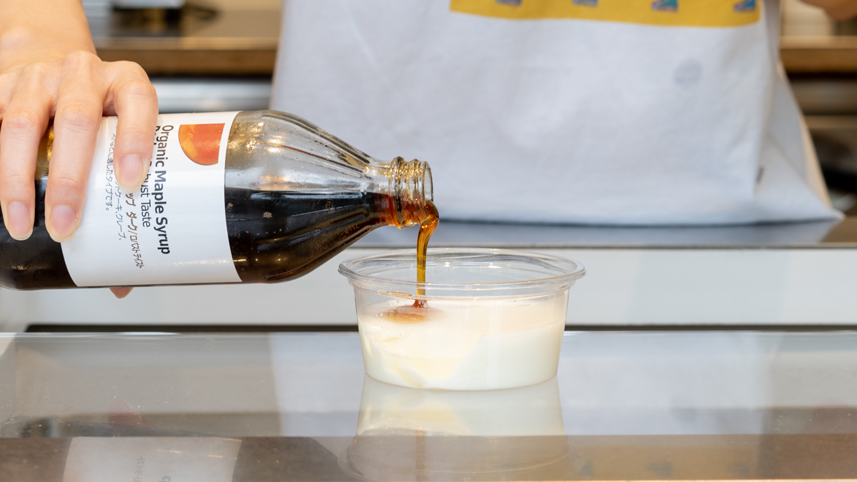 同じく「ありがとう牧場」の「放牧牛乳」を原料としているのが「しあわせチーズ工房 チーズの赤ちゃん」700円。レンネットという酵素の混合物で牛乳を固め、本来であればここから水分を抜き発酵させるなどしてチーズを作るのですが「牛乳の味をそのまま楽しんでいただきたい」と、そのまま「チーズの赤ちゃん」の状態で提供しています。こちらも味わいはピュアな牛乳そのもの、杏仁豆腐のようなプルンとした食感でした。お好みでカナダ産のオーガニック・メープルシロップをかけてもらえますよ。