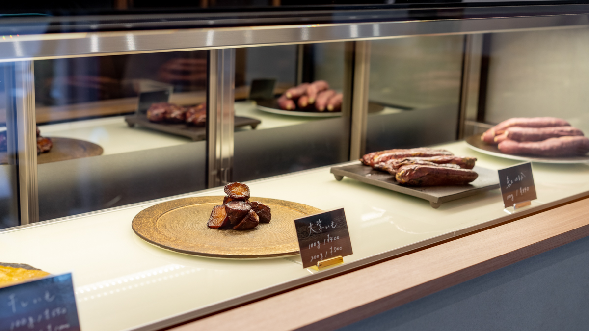 販売はテイクアウトのみ、店内も外観と同様にまるで高級ブランド品を扱っているかのような雰囲気です。これまで親しみを感じていたサツマイモが、ガラスケースのなかで宝石のようにきらめいていました。