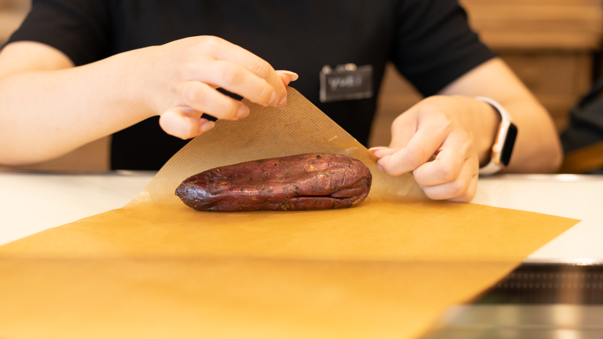 オイルペーパーに包まれた「焼きいも」は、ロゴマークのシール付きでとってもスタイリッシュ。プレゼントなどに利用してもサプライズ感を演出できそうです。「焼きいも」は「照沼」さんの紅はるかだけでなく、シルクスイートや鳴門金時といった品種の「ファーマーズ・オブ・ザ・イヤー/さつまいも・オブ・ザ・イヤー」を受賞したサツマイモがあり、いろいろと食べ比べするのも楽しそうです。