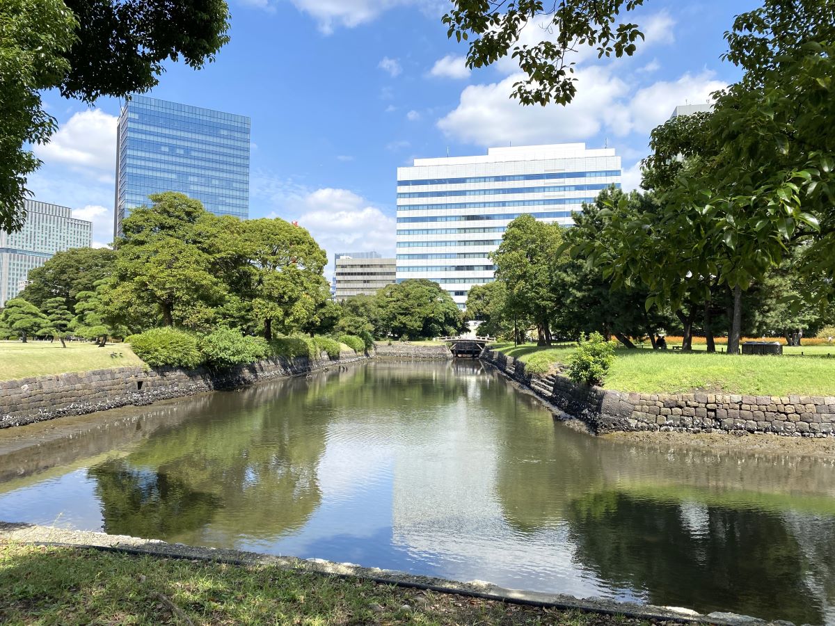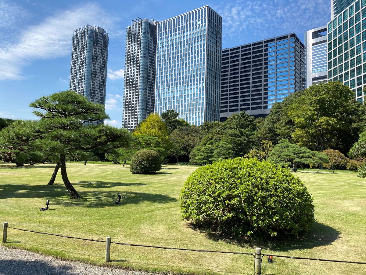 庭園内は、砂利が敷き詰められ見事な景観が広がっています。そしてその奥にはビル群が広がるというコントラストのある場所。驚くのはそのような大都会のなかにありながら、庭園内は虫や鳥の声が響くくらい、静かな空間となっていること。まさに都会のオアシスとよぶにふさわしい場所です。