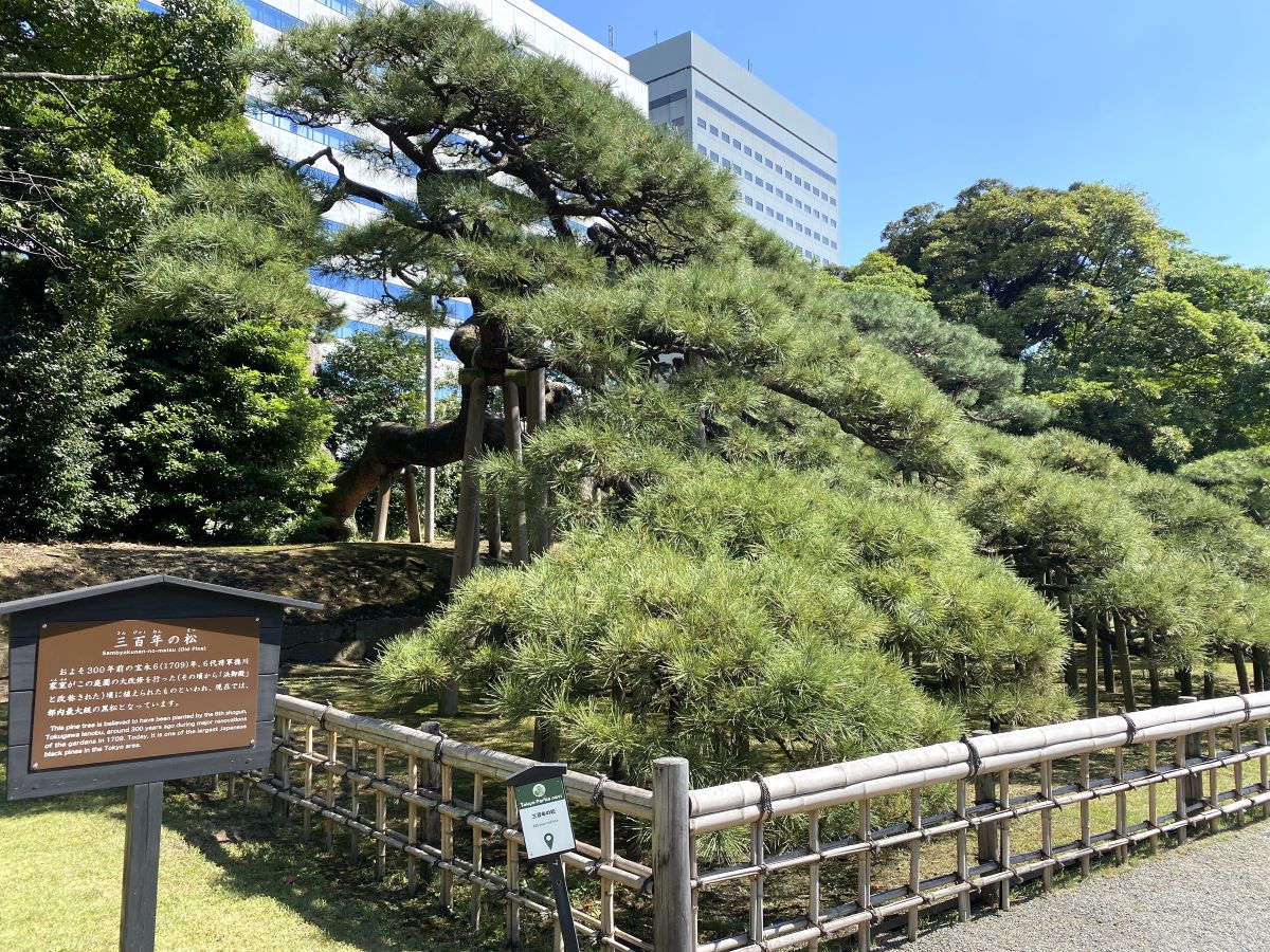 みどころはまだまだたくさんあります。そのひとつが大手門口の脇にある「三百年の松」。6代将軍だった徳川家宣が庭園を大改修したときに、その偉業をたたえて植えられたものです。その名のとおり、300年ほど前に植えられたもので、その枝や幹の太さ、雄大さにきっと驚くはず。