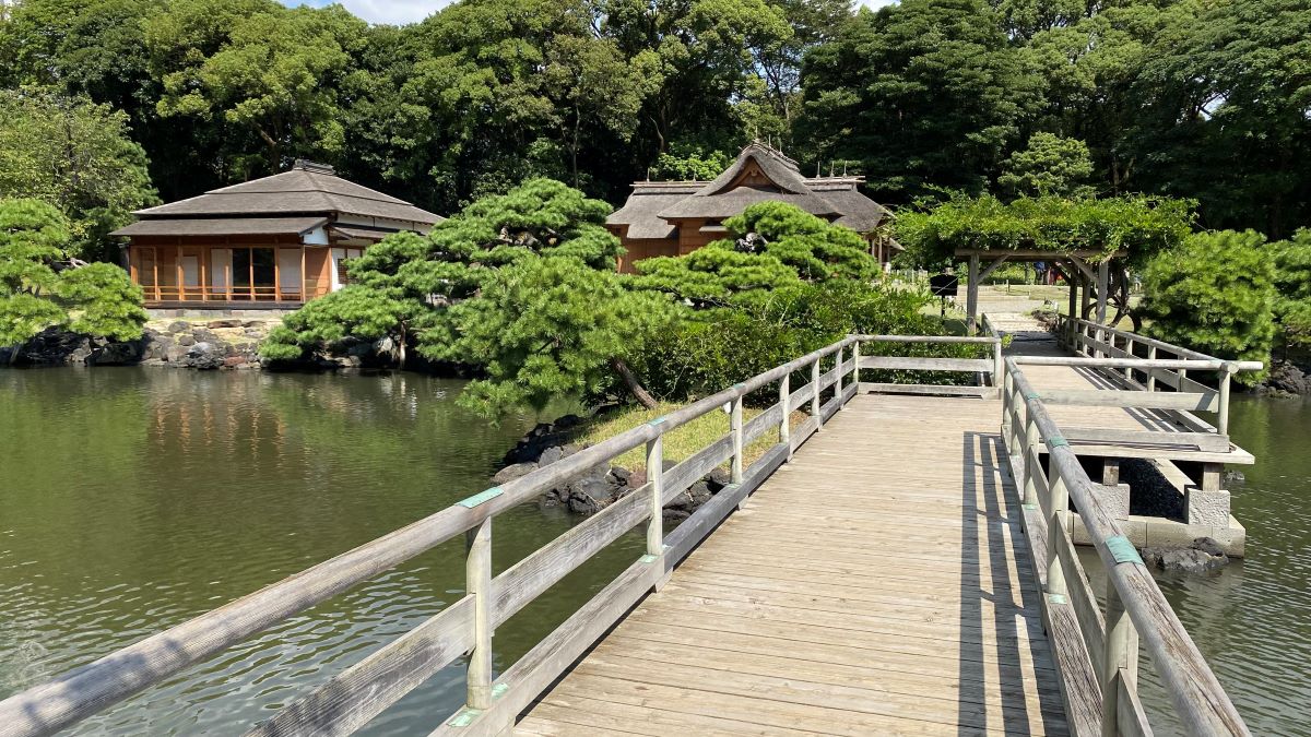 その池の岸から中島にかかっているのが2012年に改修された「お伝い橋」。全長120mの総檜造りの橋です。橋の上から潮入の池を見渡すこともできます。