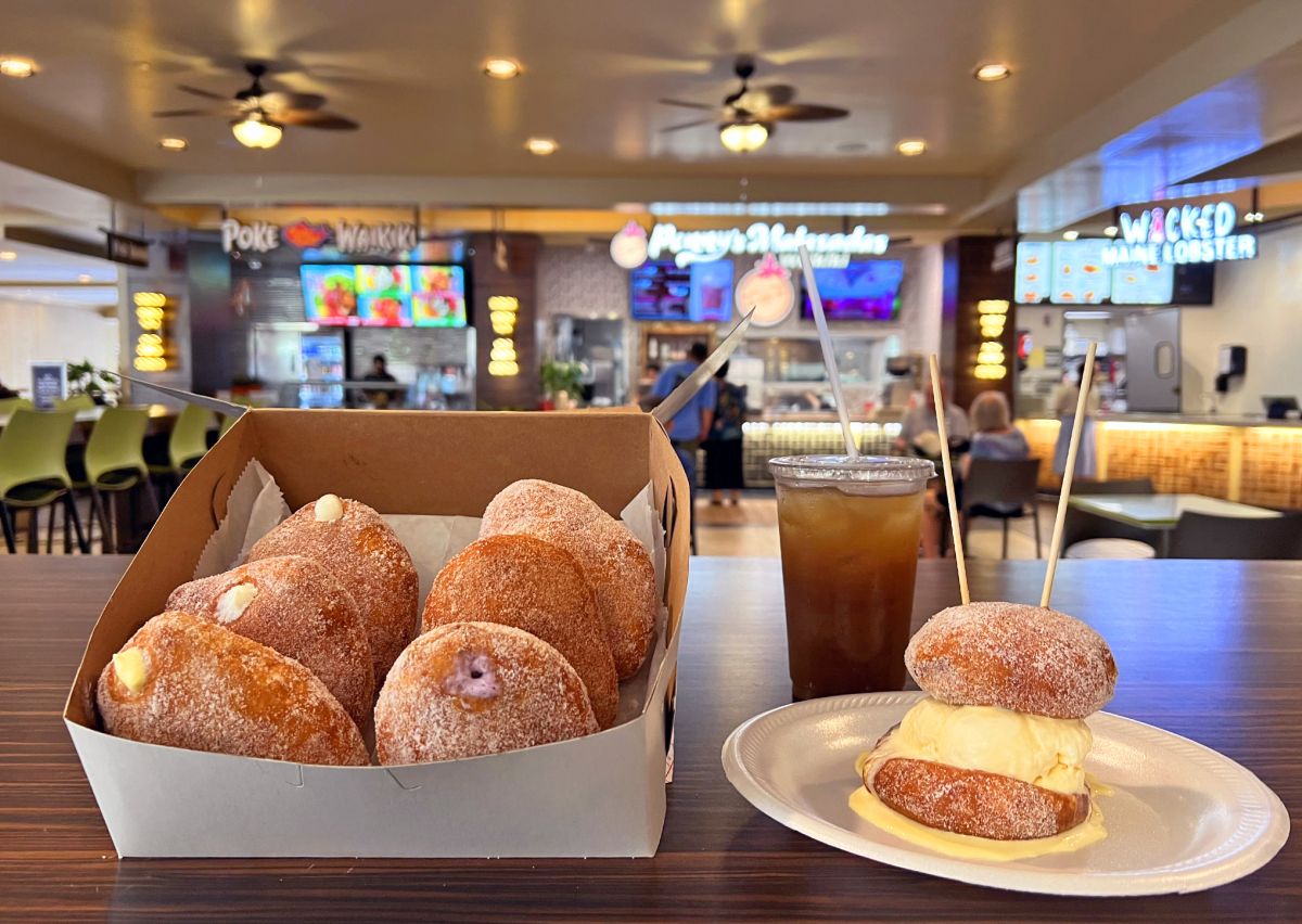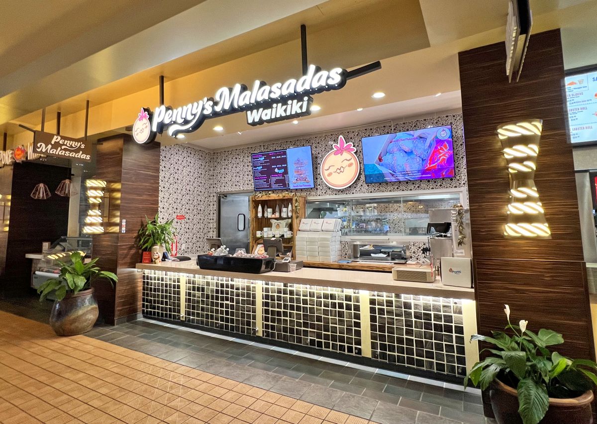 2018年にライエのフードトラックからスタートした「ぺニーズマラサダ」が2022年7月にオープンしたのは、ロイヤル・ハワイアン・センターのパイナラナイ・フードコート内。ワイキキのどこからでもアクセスが抜群で、ショッピング中の休憩にもちょうどよいロケーションです。また、午前6時から午後9時まで営業しているので、軽い朝ごはんや夜のおやつにもぴったりです。