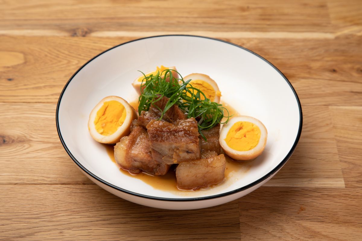 松阪豚は、選び抜かれた豚をじっくりと育てた三元交配のブランド豚。その魅力はなんといっても、甘みのあるもちもちの脂にあります。「つきたての餅」と例えられるほど弾力がある一方で、人肌で溶け出すほど脂の融点が低くさらりとした口当たり。脂まで甘くてとろける良質な松阪の豚バラ肉を、玉子と一緒にじっくり煮込みました。