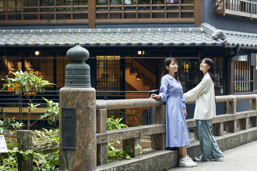 こちらは伝統的な旅館建築を背景にフォトジェニックな写真が撮影できる「一の橋」。この橋を境に、川沿いを進むハイキングコースがスタートします。水のせせらぎをそばに、紅葉を楽しみながらのんびりと歩みを進めていきましょう。