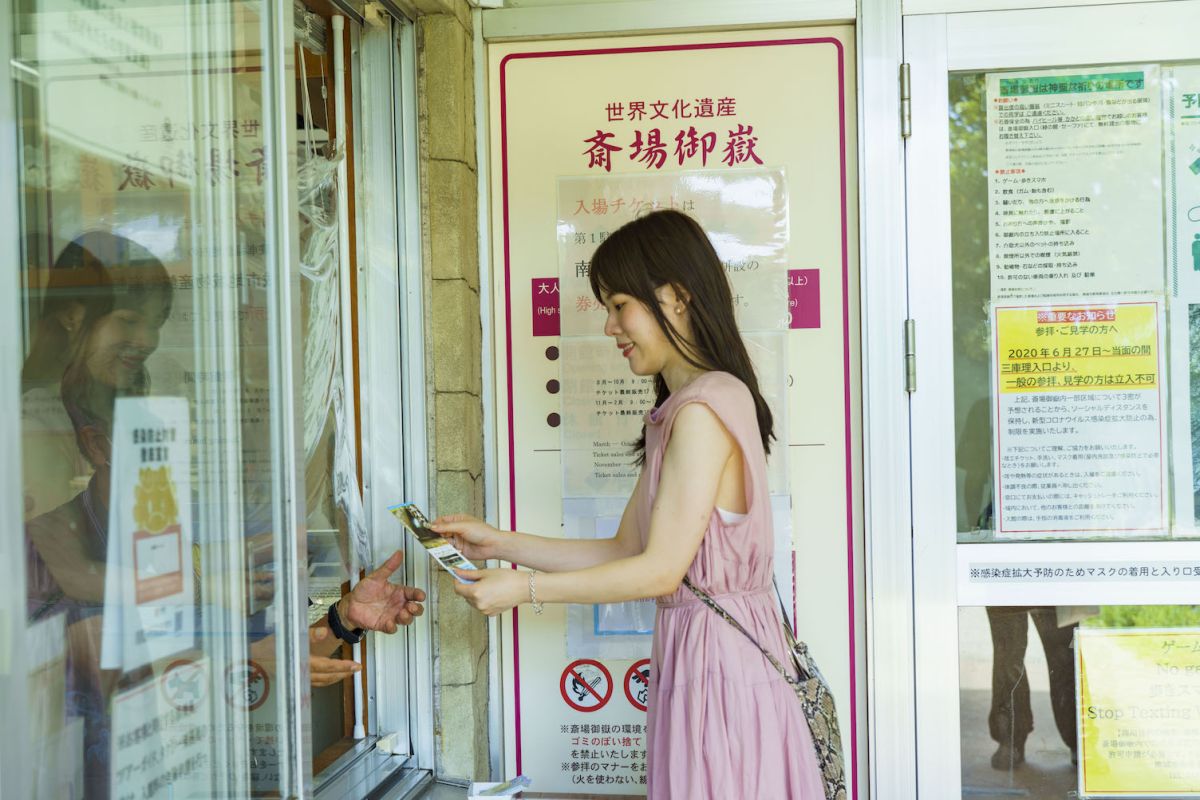 まずは国道沿いの無料駐車場に隣接し、レストランや物産館も入る建物正面にある券売所でチケットを購入しましょう。徒歩7~10分ほど離れている御嶽の入り口(緑の館・セーファ)では購入できないため、もしも忘れたらまたここに戻ってくることになるのでご注意!