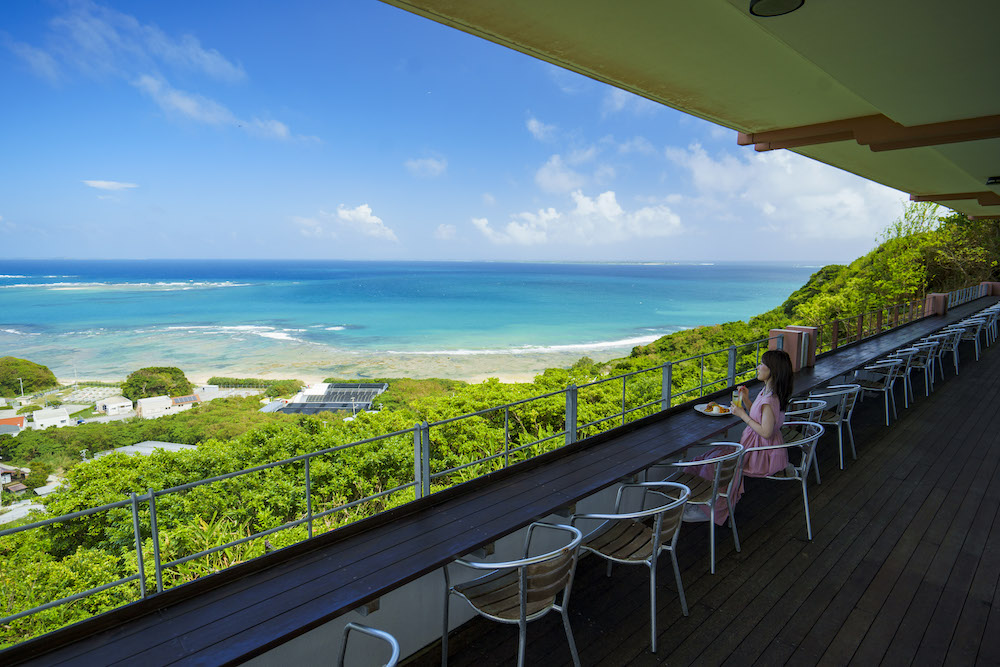 続いて、2階の「リゾートレストラン せいふぁー」で絶景ランチ。海を見渡すパノラマビューは外のテラス席のほか、店内のカウンター席からも楽しめます。