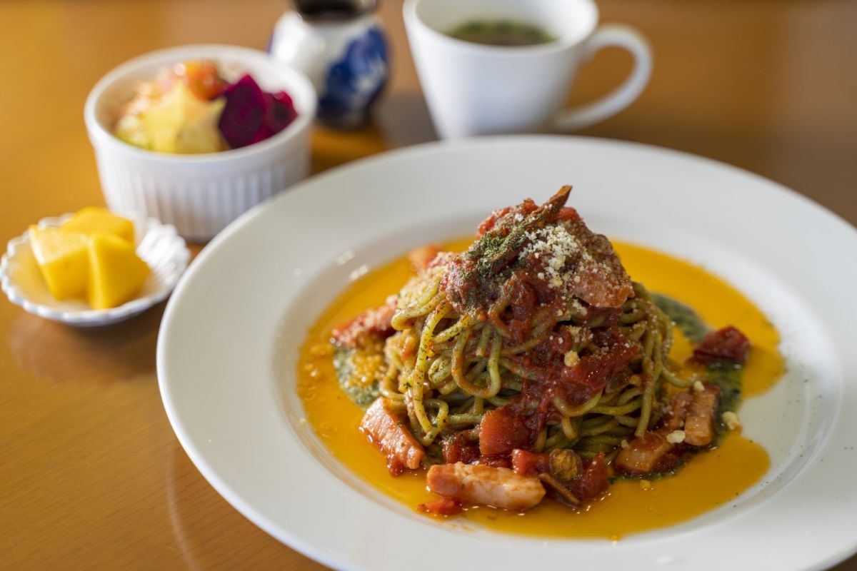 素晴らしいロケーションだけでなく、お料理の味も侮るなかれ! 女性に人気の「クレソン麺のトマトソースパスタ(ドリンクバー付き)」1300円は、著名なイタリア料理店で出されたかのようなクオリティ! 南城市特産のクレソンを練り込んだ麺にバジルソース、オリーブオイル、厚切りのベーコンなどを合わせ、ニンニクが利いたペペロンチーノのような味わいです。