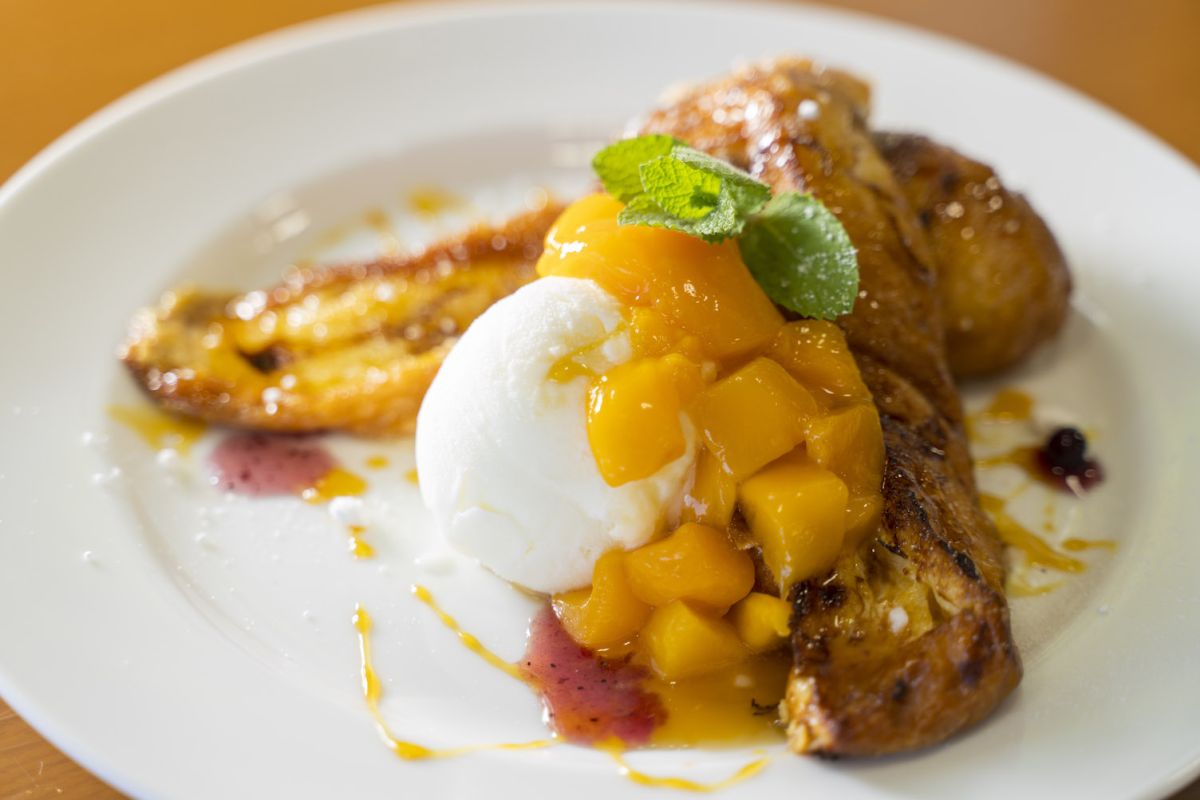 そしてもう一品、おすすめのスイーツもご紹介します。「フレンチトースト(ドリンクバー付き)」1000円は、1/2本のバゲットをまるまる使ってボリュームたっぷり!自家製のキャラメルソースや濃厚な県産マンゴーなどに加え、アイスはバニラではなく地元EMミルクを使ったミルクアイスを採用。さっぱりとした後味なので、ペロリといただけちゃいます。