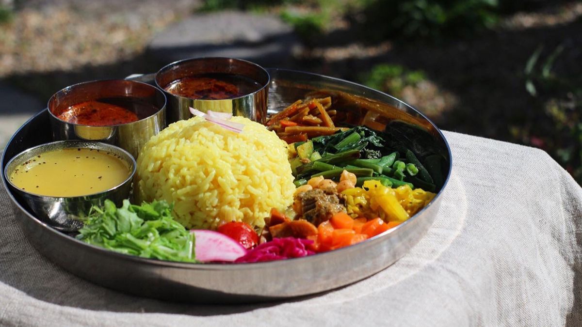 豆スープ、野菜のおかず付きで、さらりと食べられる出汁カリー。朝から至福のカレーでスタート!