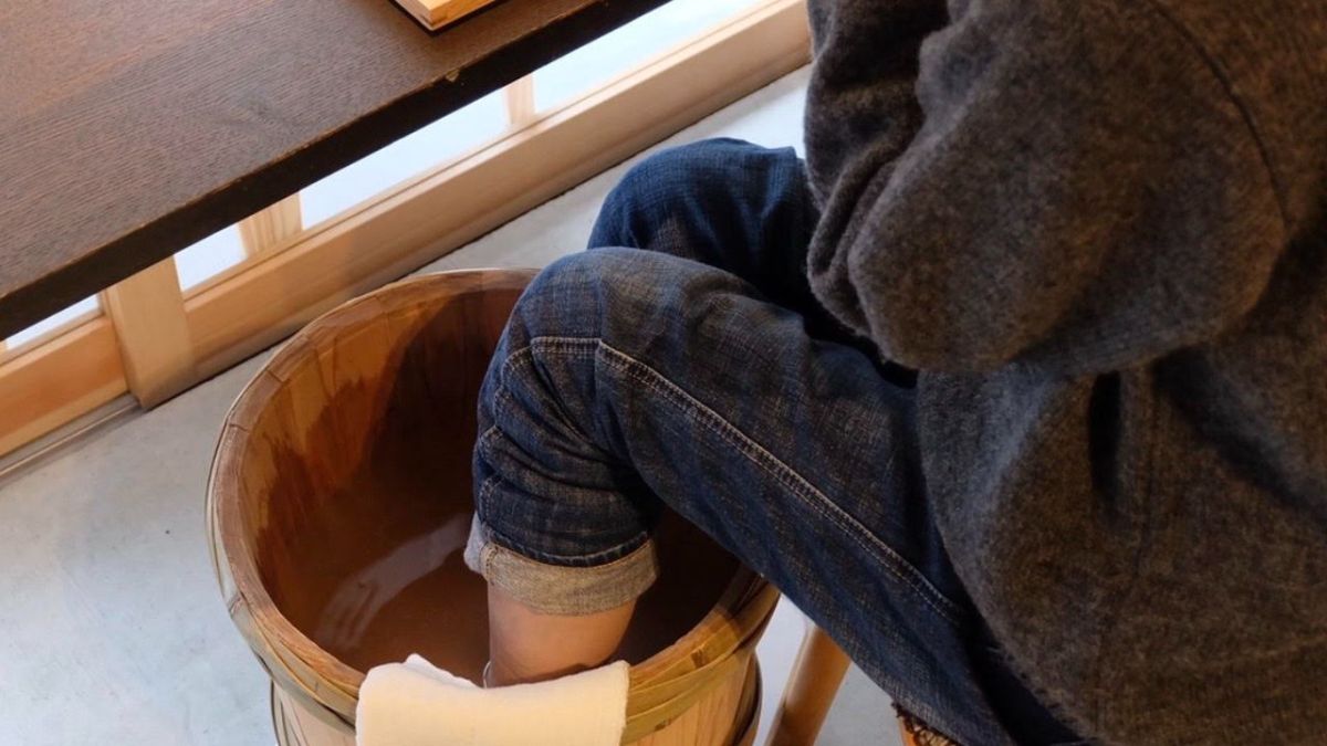 朝足湯で元気よく1日をスタート!ひとりひとり用意される吉野杉の樽に入った生姜入りのお湯に足を付けて、心身共にリラックスしましょう。