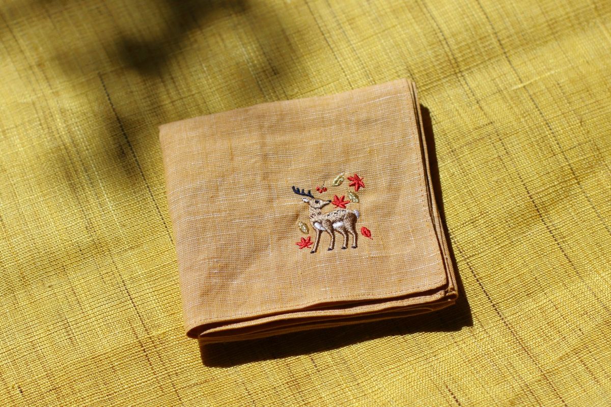 この秋限定柄が、中川政七商店のハンカチ刺繍サービスに登場。キュートな鹿の回りを舞う美しい紅葉が秋の雰囲気たっぷりの刺繍です。奈良のおみやげや思い出にぜひ。ハンカチ1000円~、刺繍代550円