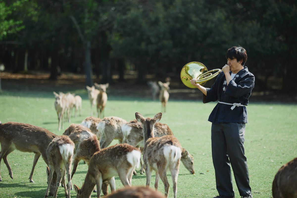 ナチュラルホルンの音色が響くと、たくさんの鹿が森から駆け寄ってきます。奈良公園の風物詩「鹿寄せ」の迫力をぜひ体験してください。