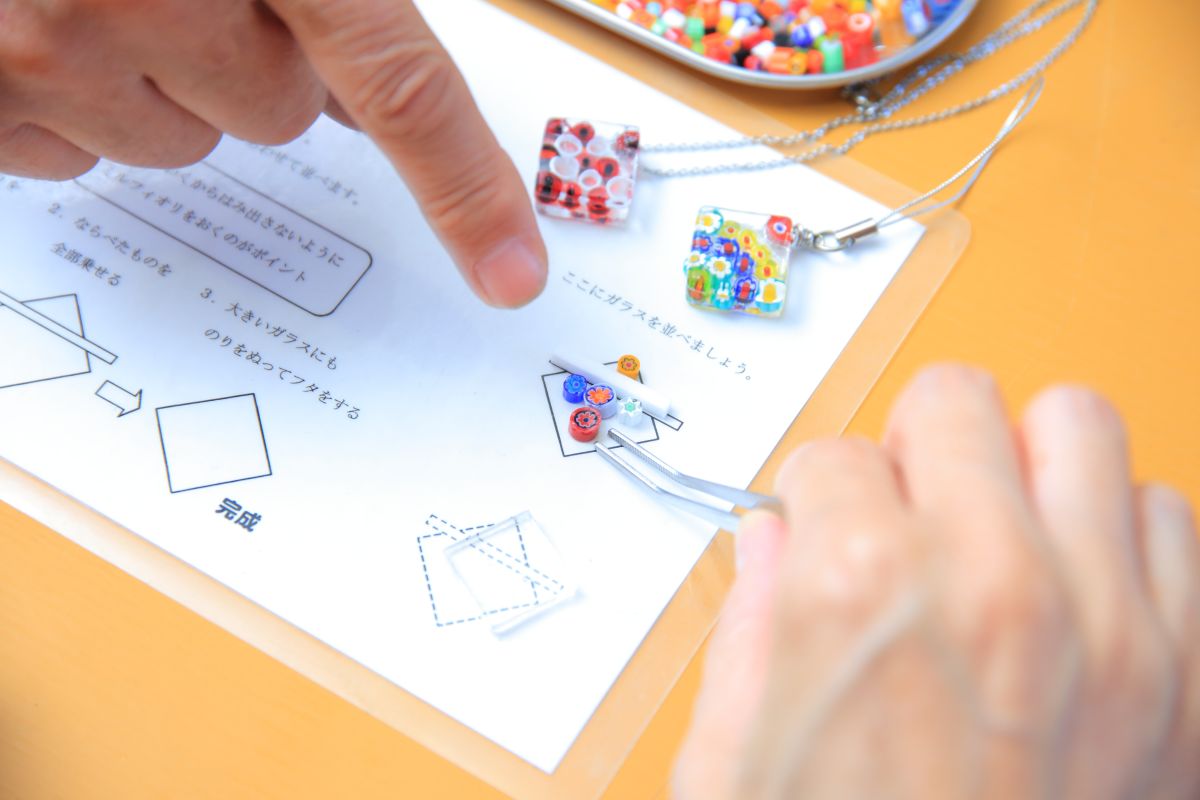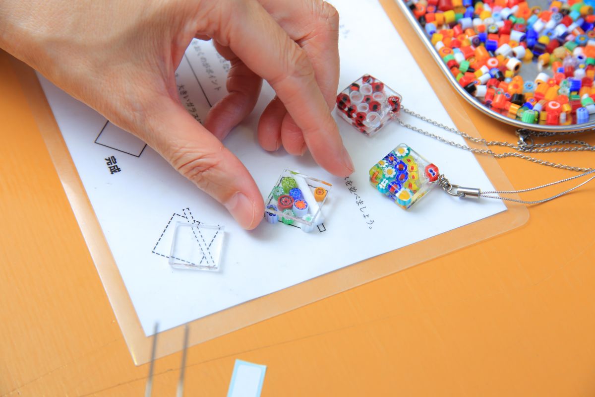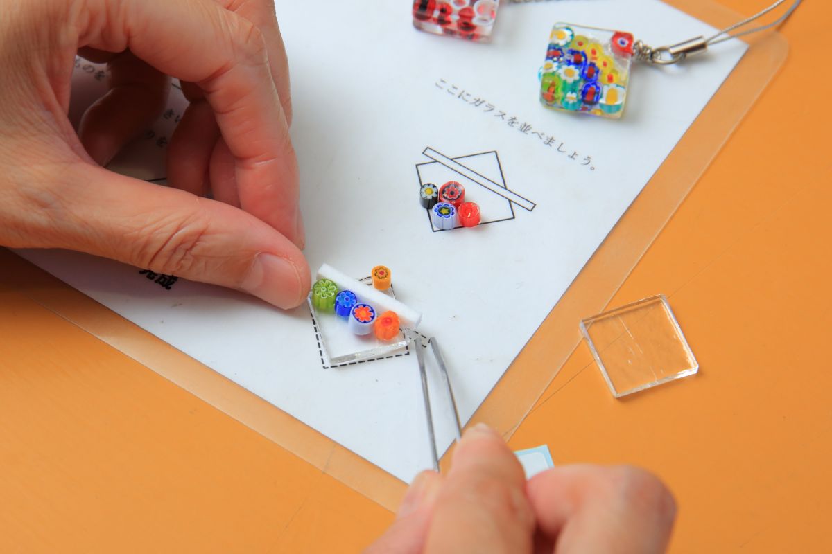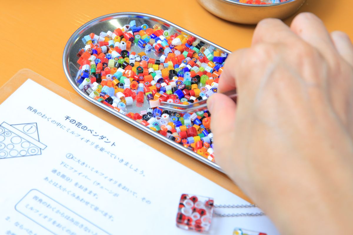 イタリア語で「千の花」という意味を持つ「ミルフィオリ」(硝子ビーズ)を使って、ペンダントかストラップを選んでオリジナルアクセサリーを作ります。