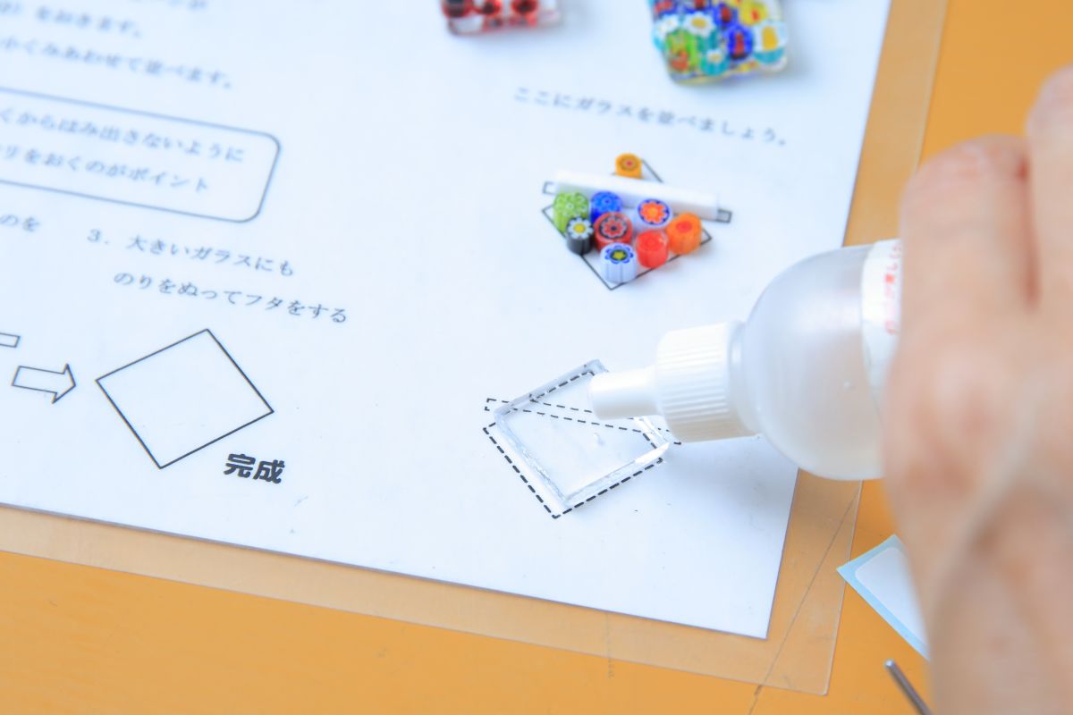 四角の枠からはみ出さないよう枠線内にミルフィオリを納めるのがポイント!ミルフィオリは厚みがいろいろあるので、できるだけ同じ厚みのものを並べると仕上がりがキレイになります。板ガラスでサンドするので、途中板ガラスを乗せて高さのバランスも確認します。
