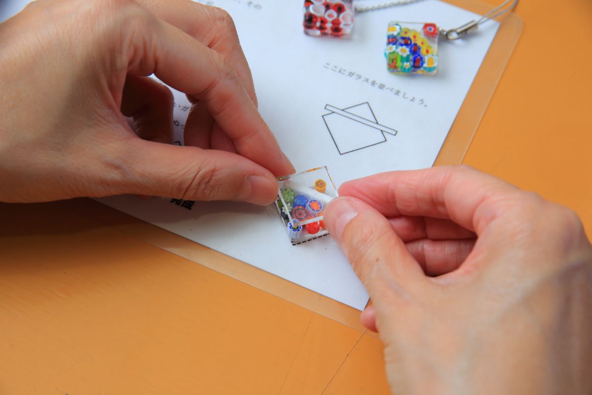 スタッフの方から説明を受けたら、見本を参考にしながら、紙に書かれた四角い枠を使ってデザインを考えます。まず上部の角に選んだミルフィオリを1つ、そしてチェーンが通るスペースを確保するためにファイバーという素材を置きます。あとは自由にピンセットを使ってミルフィオリを並べていきます。