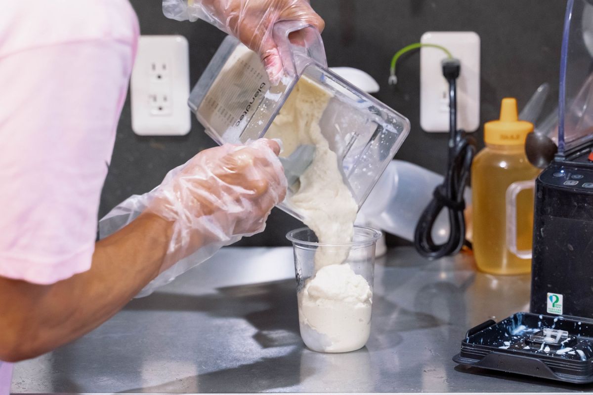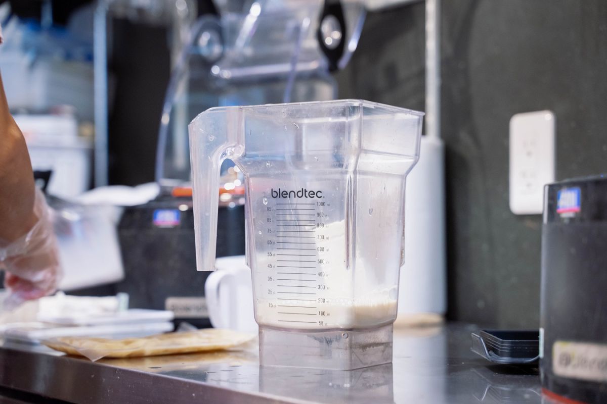 ミキサーでしっかり攪拌させたら、ナタデココとともに豆腐スムージーを流し入れ、すべてのベースの味わいとなるバナナ味のスムージーの完成です。豆腐やバナナなど固形物を多く加えているので、できたてはかなりどっしりとしたテクスチャー。とはいえ飲み心地はさらっとしていて、するする飲めます。