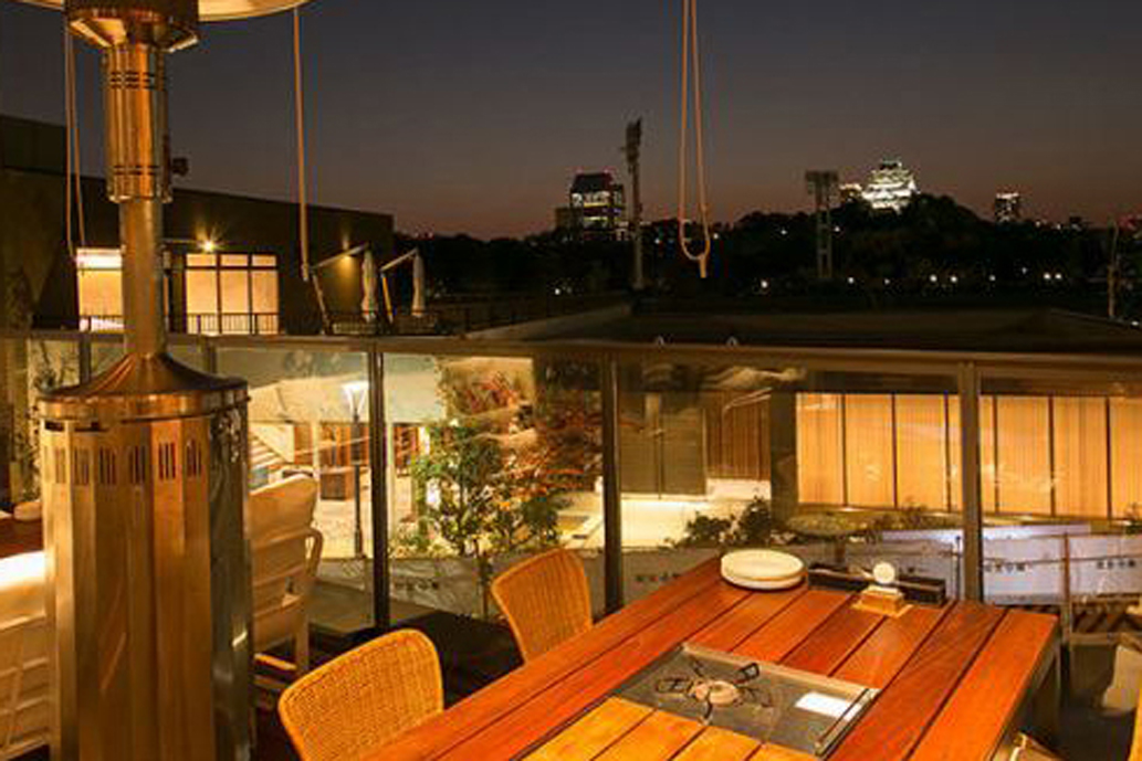 夜になるとテラス席はこんな雰囲気に。ライトアップされた天守閣に気分もあがります♪