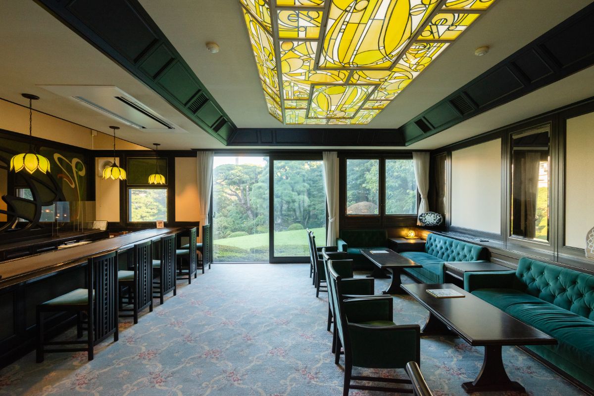盛りだくさんの鑑賞を終えたあとは、フロント近くの喫茶室「やすらぎ」で一服を。 館内の雰囲気をそのままに、レトロ感満載の空間が広がっています。正面の大きな窓からは、庭園を眺めることもできますよ。