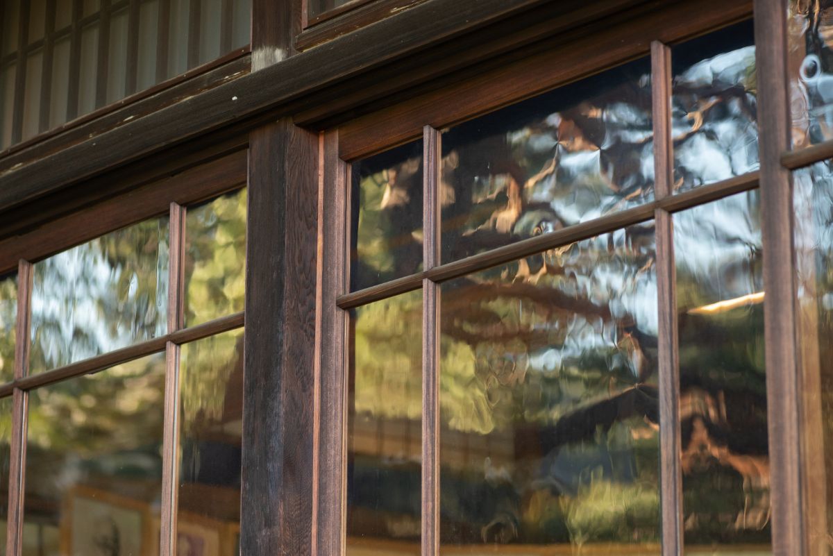 不規則に波打つ窓は、大正時代に造られていた「大正ガラス」。ゆらゆらとした質感は、現代ではなかなかお目にかかれない希少価値の高いものです。石川県・加賀藩の伝統塗料による、鮮やかな群青色の壁にも目を奪われます。