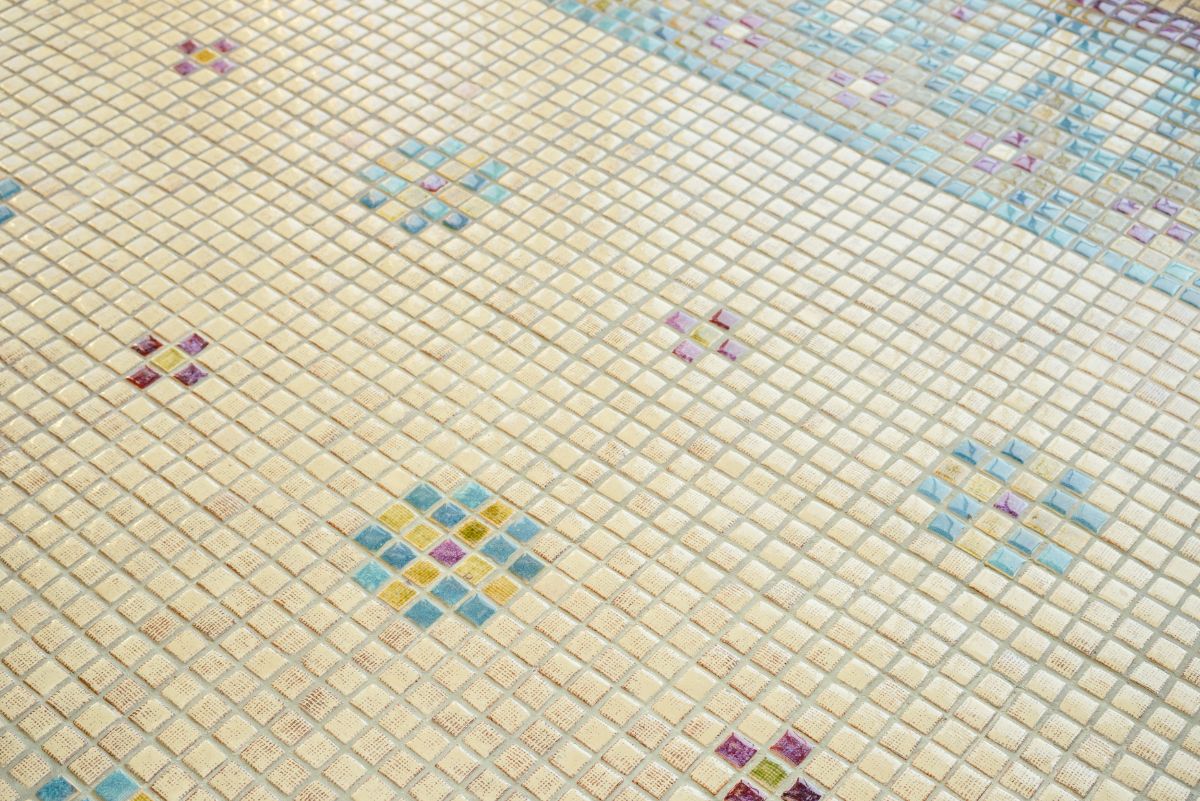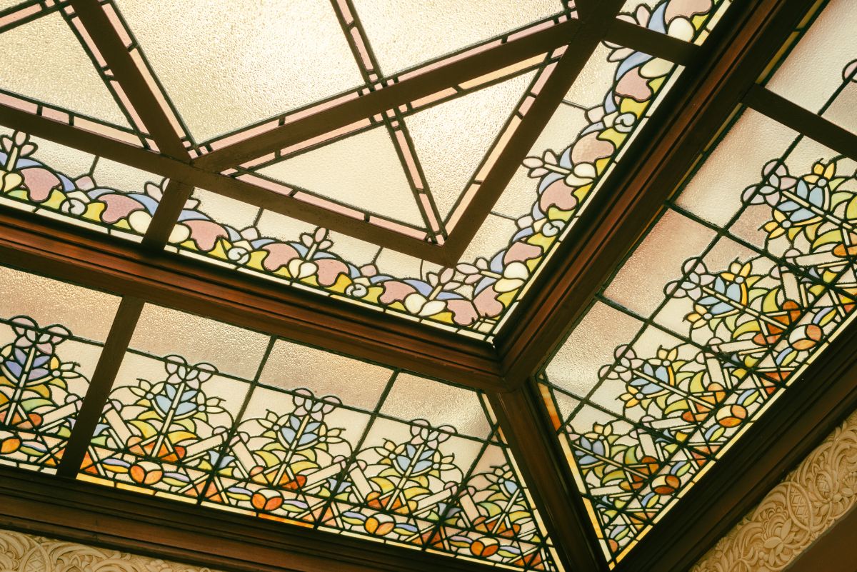 足元を見ればモザイクタイル、目線を上げればステンドグラスが。それぞれ花がモチーフとなり、アール・デコの様式美を感じます。