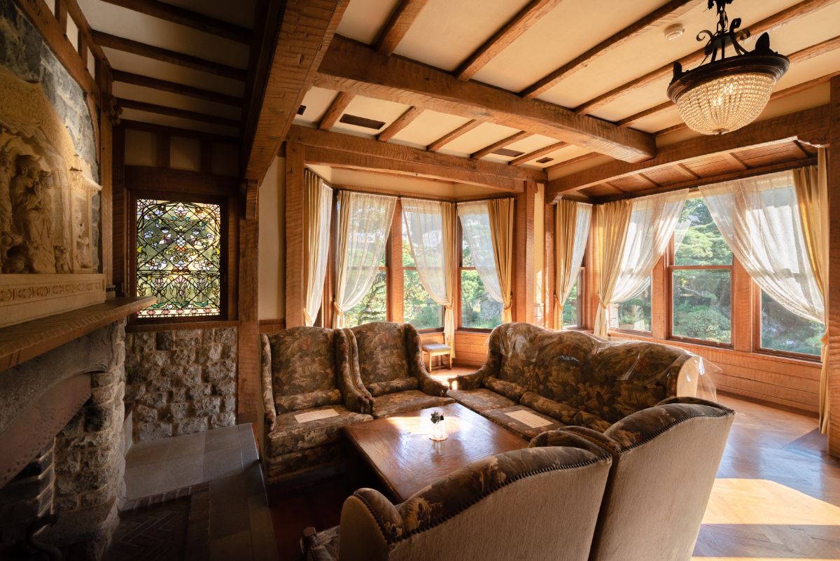 続く客間は、暖炉を中央に配置した洋館の造りで、昭和初期のレトロ感が満載!