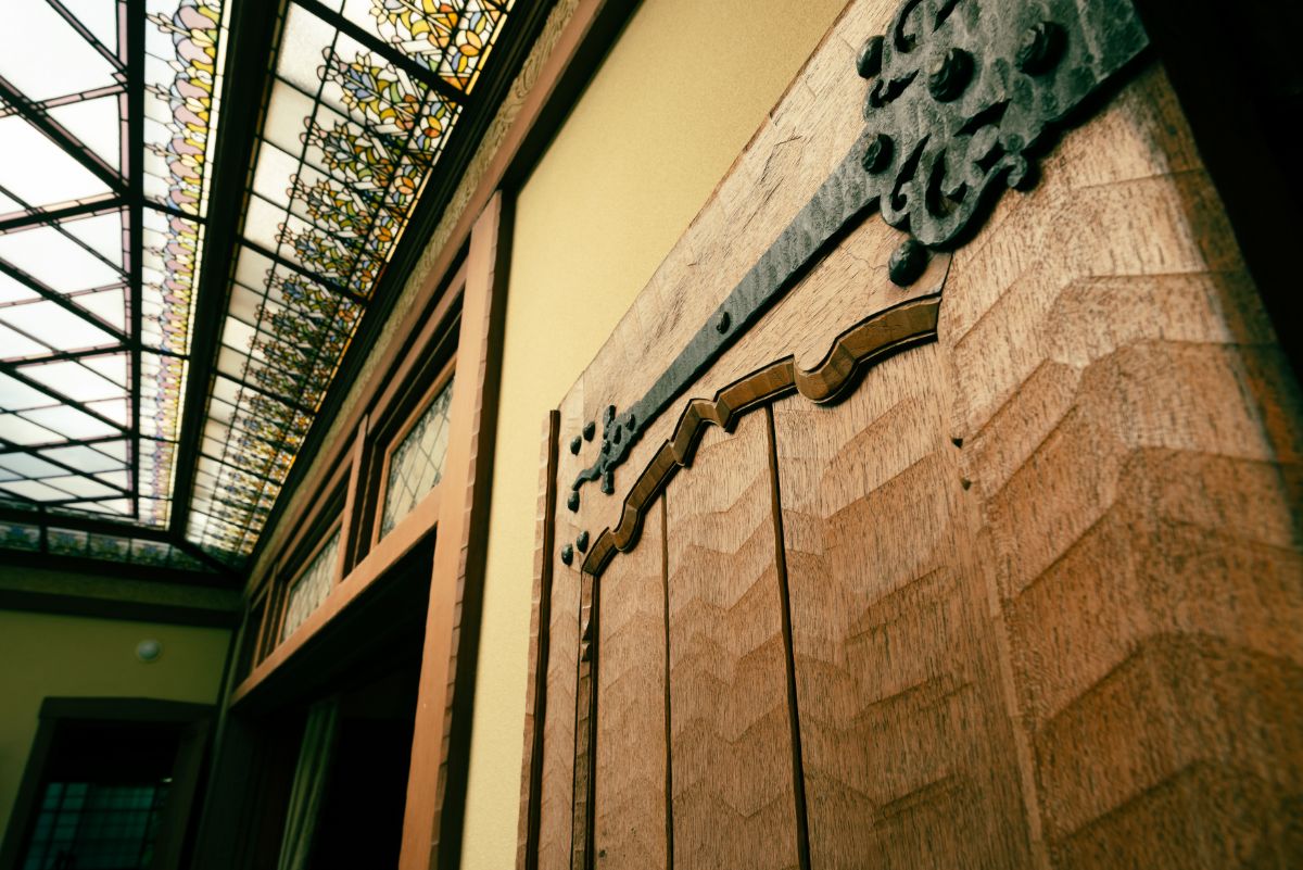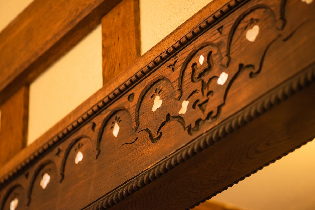 扉や柱に波打つように施された模様は、工具の一種である釿(ちょうな)を使ったもの。当時の職人たちの技が光ります。
