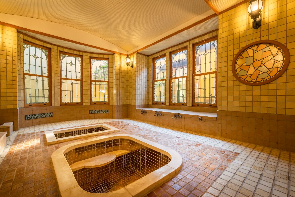 ローマ風浴室のある「金剛」もお見逃しなく。昭和4年(1929)に建てられた浴室は、ステンドグラスの窓から燦々と陽が入る贅沢な空間。浴槽は、滑り止めも兼ねたという木製タイルで囲まれています。