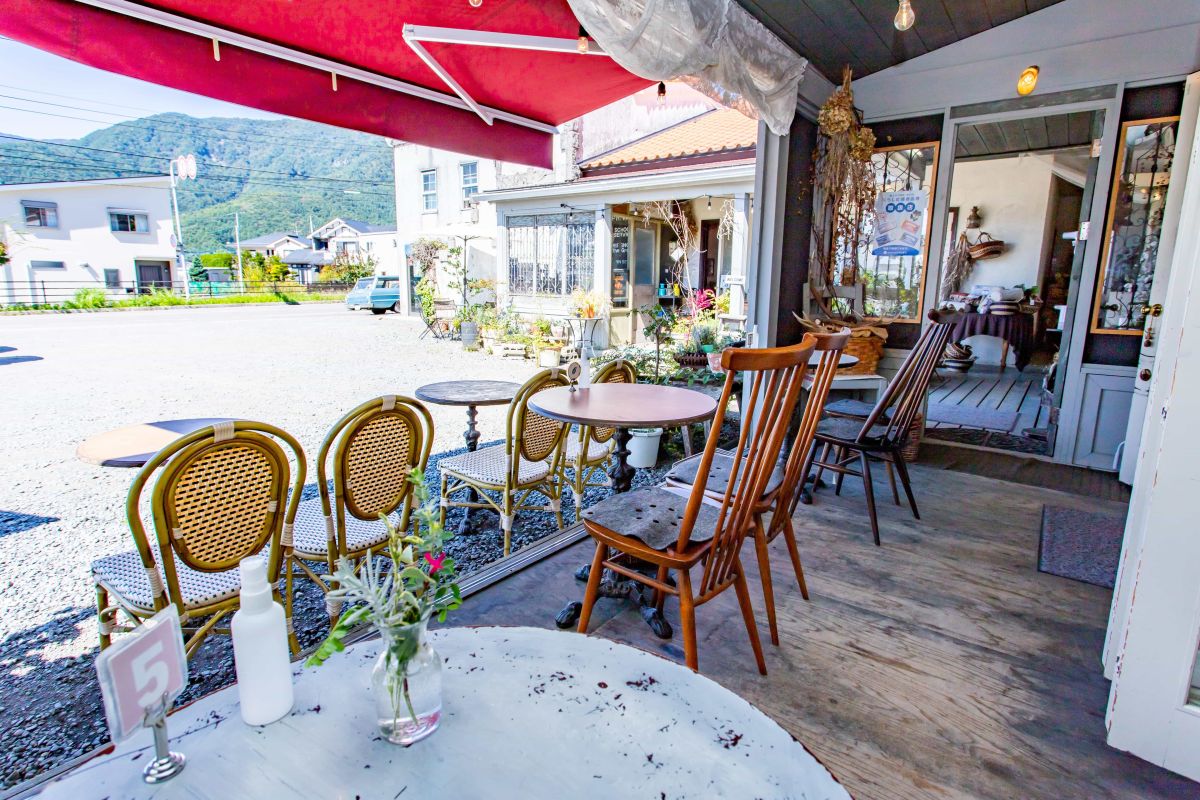 テラス席は緑が広がる景色が楽しめるよう、庭に向かって椅子が配置されています。大通りよりも車通りが少ないのも嬉しいポイント。山々を臨みながらいただくコーヒーは格別です。