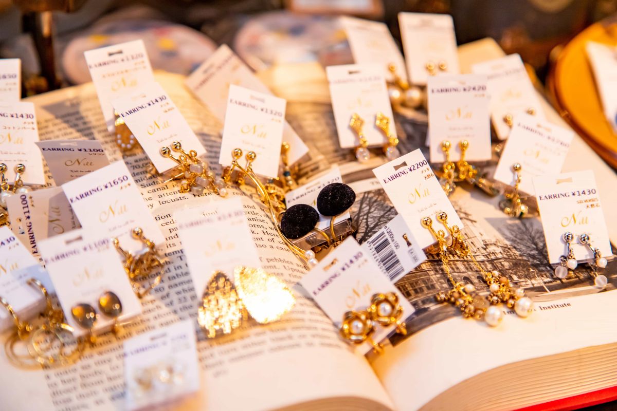 洗練されたデザインのアクセサリーも1000〜2000円台というお手頃価格で揃っています。一つひとつデザインが違うピアスやイヤリングはオンオフどちらにも使えそうなものばかり。ほかにも、ネックレスやヘアゴム、バレッタといったアクセサリーも並べられています。