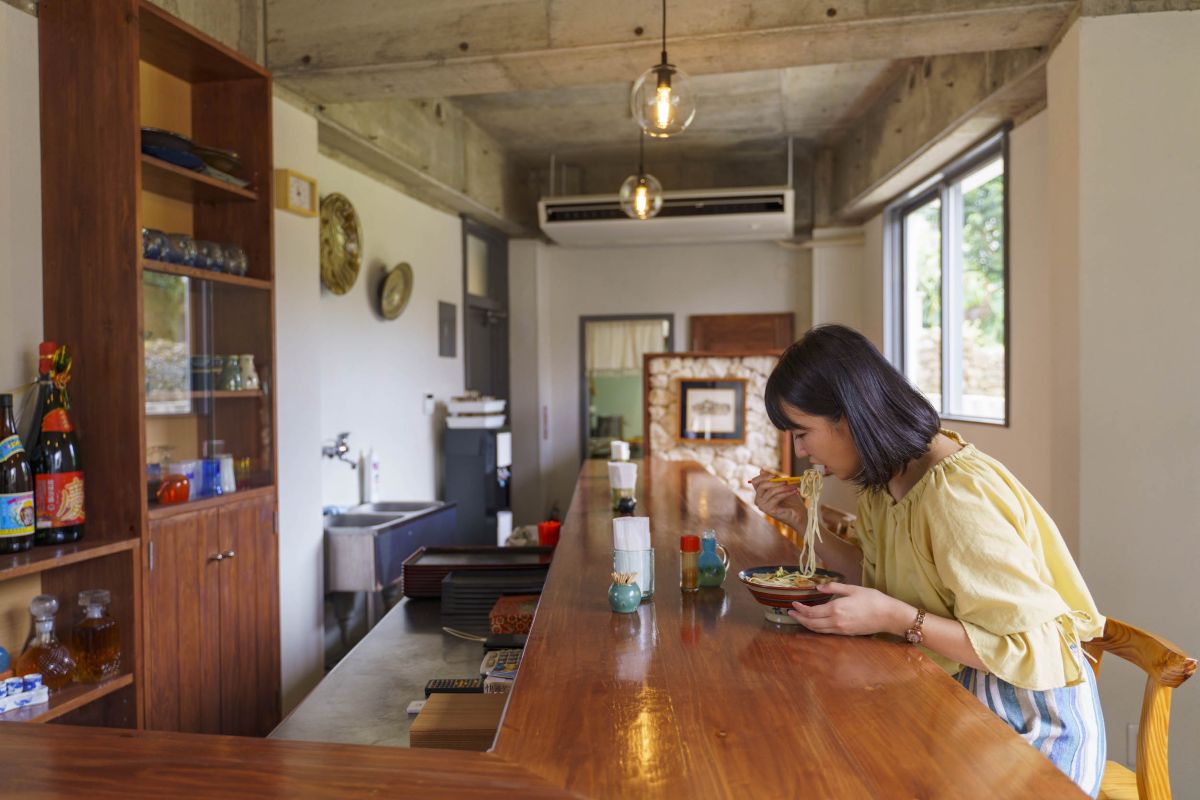 古民家を改装してテーブル席や座敷席もある1号店と比べ、2号店はカウンター8席だけのシンプルな造り。ここにも、ゆっくりとお客さんに自らそばをふるまいたいという、2号店を出す際のオーナーの思いが込められています。「首里城公園」の裏手にあたる1号店に対し、2号店はメインゲート側にあるので、散策途中に立ち寄りやすいのも便利です。