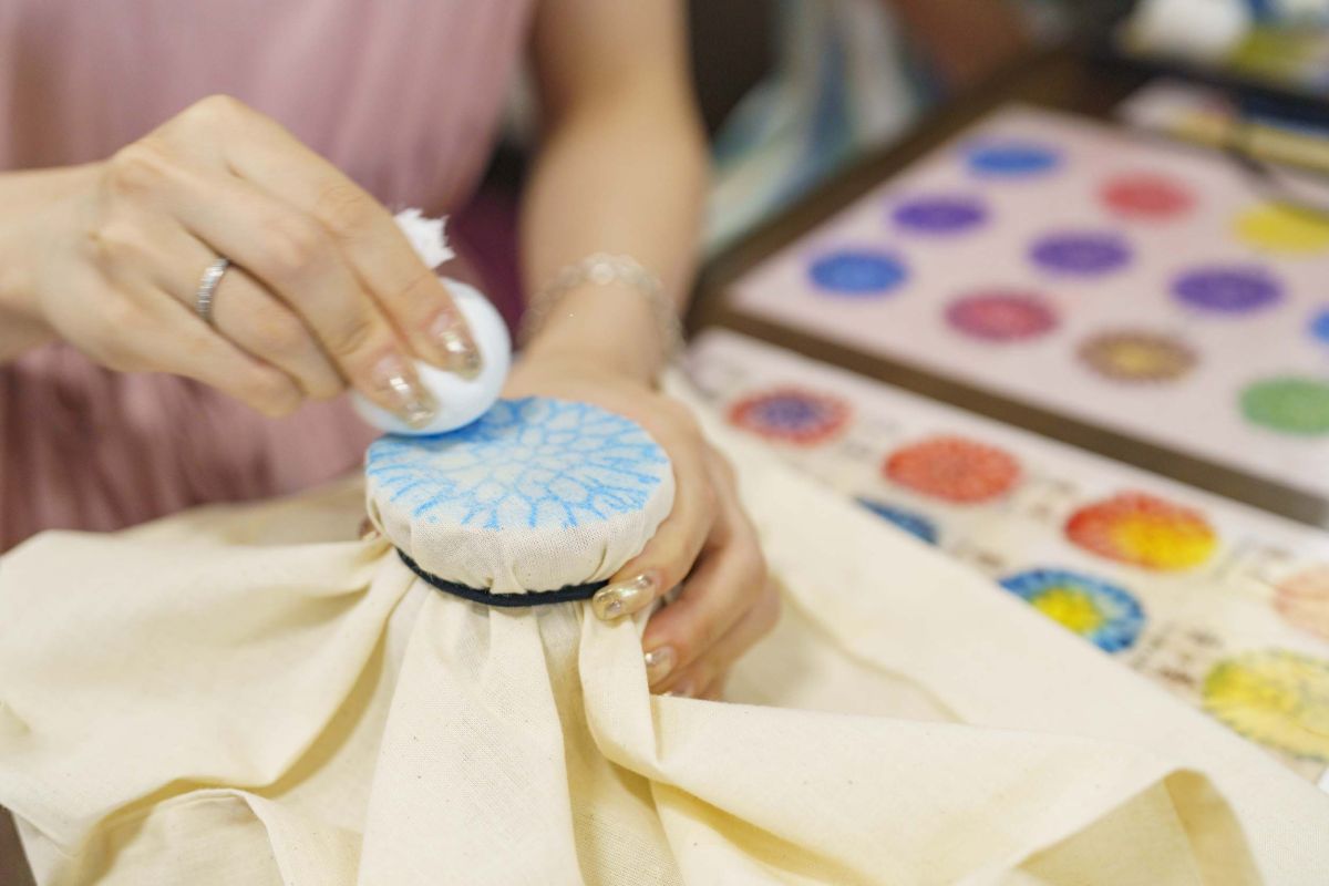 サンゴ染はテーブルに用意された大小さまざまなサンゴの型から選び、染めたい部分の生地をゴムでしっかりと固定するところからスタート。4色の染料を含ませたタンポ(染め道具)を、生地の上からこするようにして模様を出していきます。途中で色を変えればグラデーションもでき、カラフルで美しく仕上げることも可能。テーブルには色の作り方を説明した色見本もあるので、参考にしてみましょう。サンゴの独特の模様が幻想的な色合いとマッチして、世界にひとつだけのとっておきの自分みやげが作れますよ。