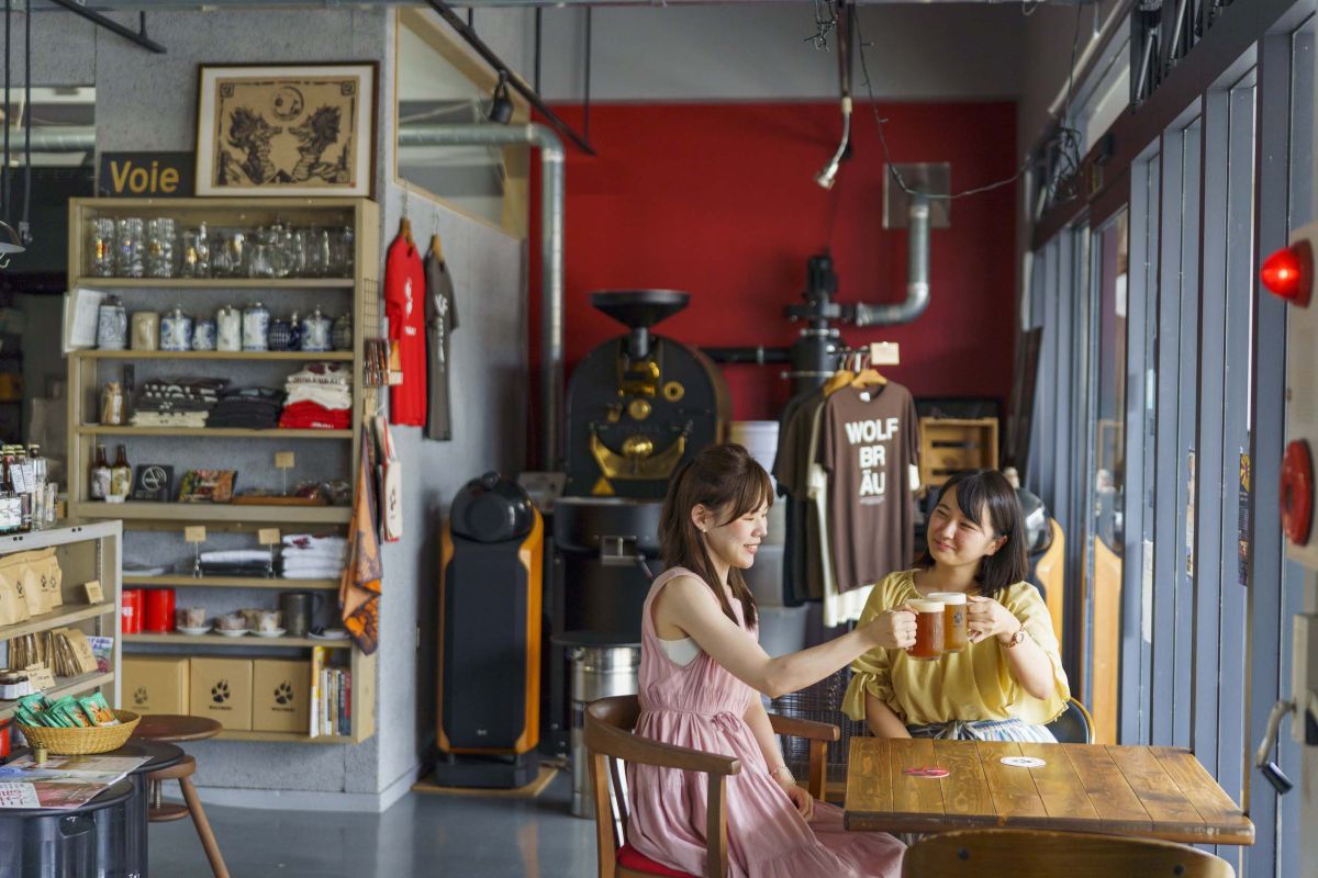 「ウォルフブロイ(うぉるふぶろい)」はドイツ出身のオーナーと日本人の奥様が営む、クラフトビールと自家焙煎コーヒーのお店。ビールは旦那様、コーヒーは奥様が主に担当されています。陽光が差し込む大きなガラス壁から首里の町並みが眺められる店内は、コーヒー豆の焙煎機やドイツ直輸入の麦芽が入ったモルト袋が置かれ、まるでヨーロッパの街角のカフェ&バーのよう。奥にはクラフトビールの醸造所も併設されていて、自慢の大型特注タンクが整然と並ぶ様も見られます。