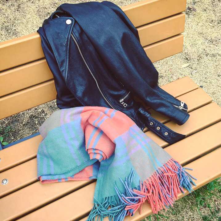 そして、この時季のおでかけでは、夜になると急に寒くなったりするので、気温調節のアイテムは必ず持参します。ジョンストンズのカシミア100%の大判ストールは、コーディネートのポイントになるだけでなく、ブランケット代わりに膝にかけたり肩掛けしたりと、一枚あれば安心。またレザージャケットも、シーズンレスのアウターとして登場頻度の高いアイテム。さらりと肩掛けすれば、フレアスカートも甘くならずに大人っぽくまとまります。