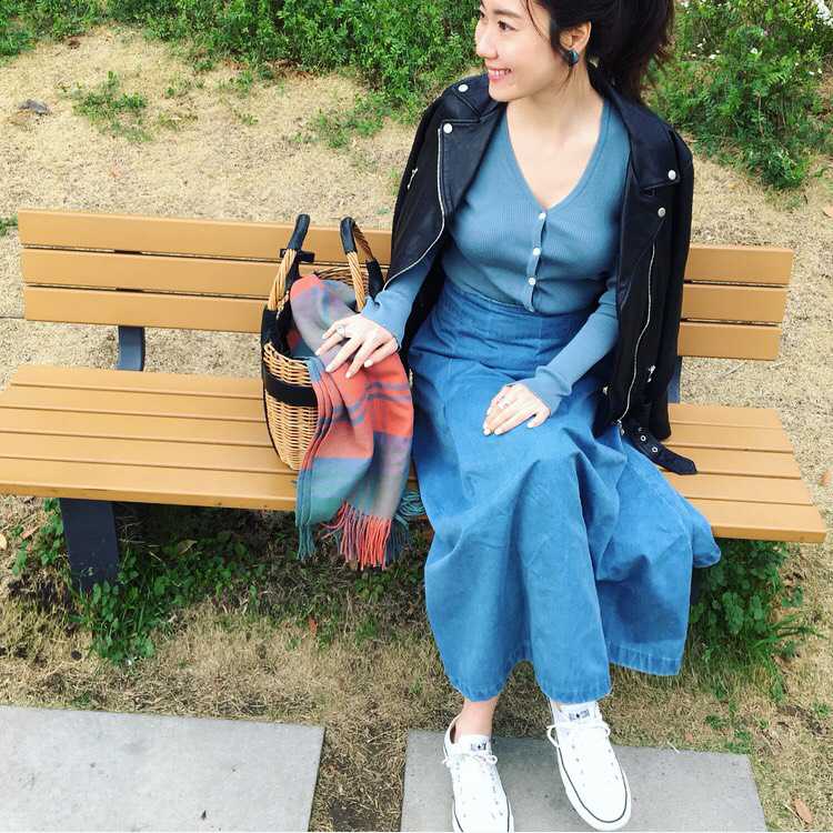 まず選んだのは、マキシスカート。たくさん歩くだけでなく、場合によっては敷物をしいて長時間地面に座ったりすることを考えると、デニムなどは動きやすいようで意外に窮屈なので、私はこういうときはゆったりリラックスできるフレアスカート。靴がスニーカーやフラットシューズでも、パンツより脚長&フェミニンに見えるのも理由のひとつ。さらにこれはデニム地なので汚れも気になりません。