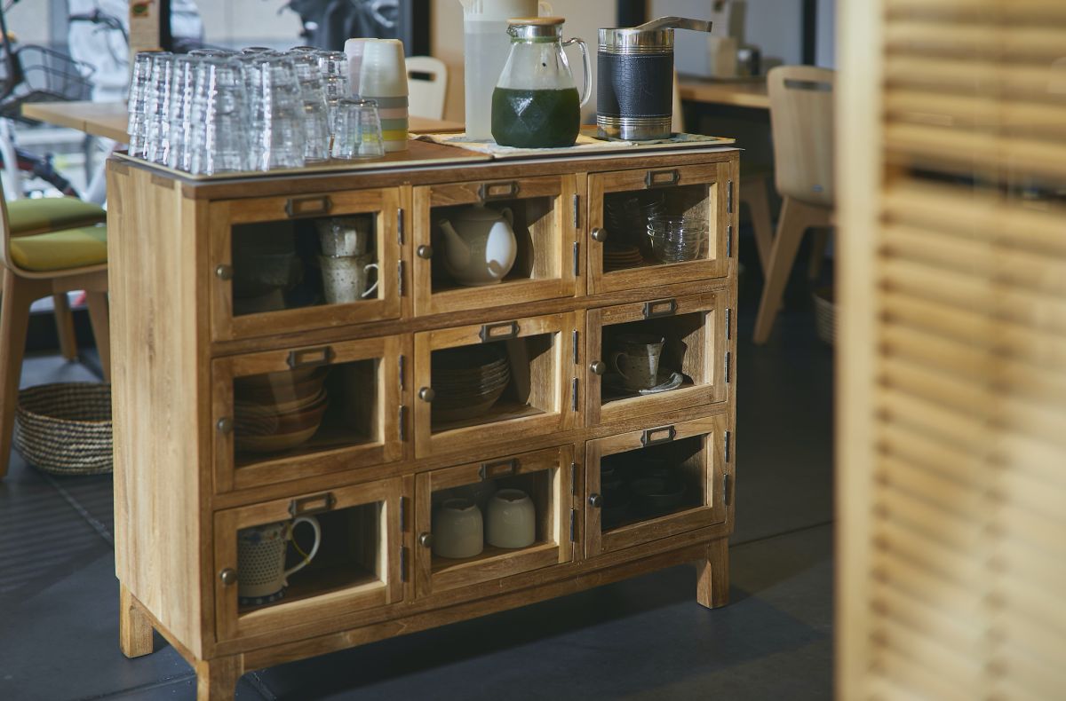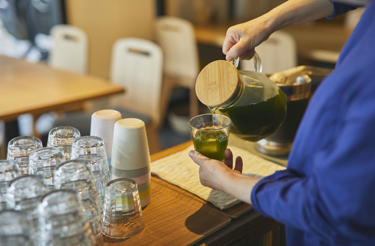 木製の飾り棚の上に置かれたクロレラ茶はセルフサービスでおかわり自由。抗酸化作用が期待できるクロレラ茶のサービスはかなり好評だそう。