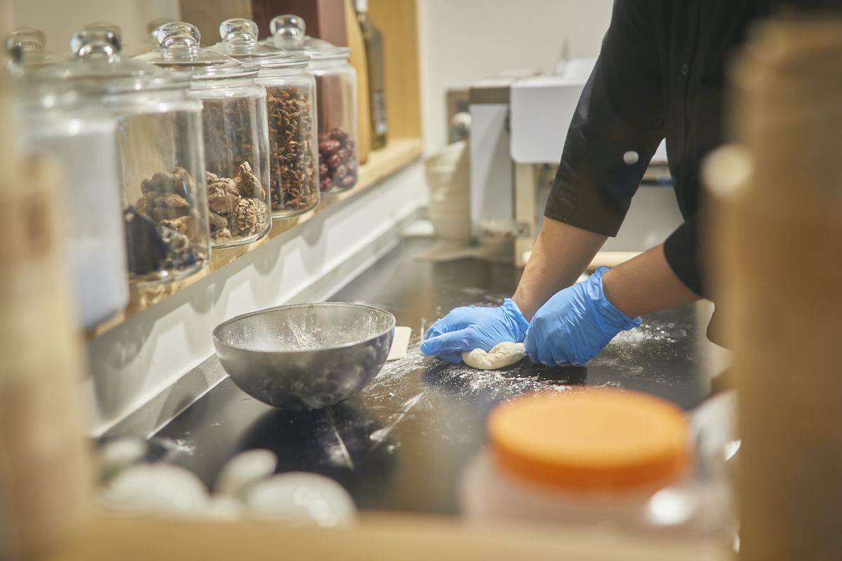 台湾料理には珍しく、オープンキッチンで奥の作業場もスケルトン。写真は人気メニューの一つ、水餃子の皮を捏ねているところ。皮もすべて手作りというこだわりです。
