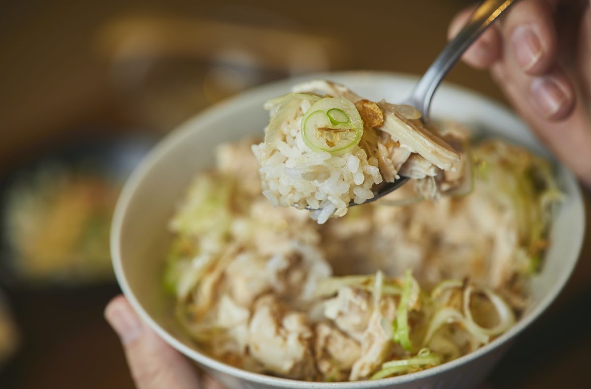 今回選んだのはジーローハン。蒸した鶏肉と白髪ネギに香味ソースをかけた丼です。特筆したいのが、鶏肉の食感。パサパサとした印象の強い鶏むね肉ですが、この店のものは、しっとりとしつややかな見た目に弾力もあり、まるで別物。低温で長時間かけて肉に火をいれているそうですが、これほどまでに鶏むね肉をおいしいと感じたことがなくて驚きました。