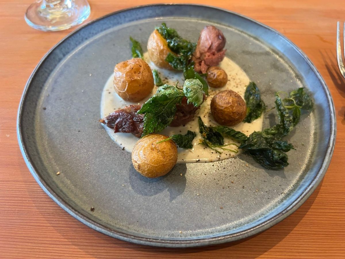 そして、2皿目は「鴨のコンフィと男爵のスモーク 発酵バターミルクとモロヘイヤ」。盛り付けもとっても美しいですよね。お肉は重くなりがちですが、朝なので味付け含め軽やか。ただ、それでもずっしり肉と野菜のうまみが感じられて、香ばしさがたまらないひと品でした。