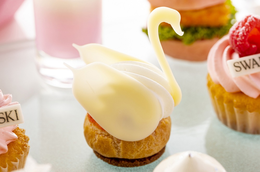 サクサクとしたシュー生地にラズベリークリームを入れ、ホワイトチョコレートの飾りを纏わせて、Swarovskiのシンボルである美しいスワンに仕上がっています。