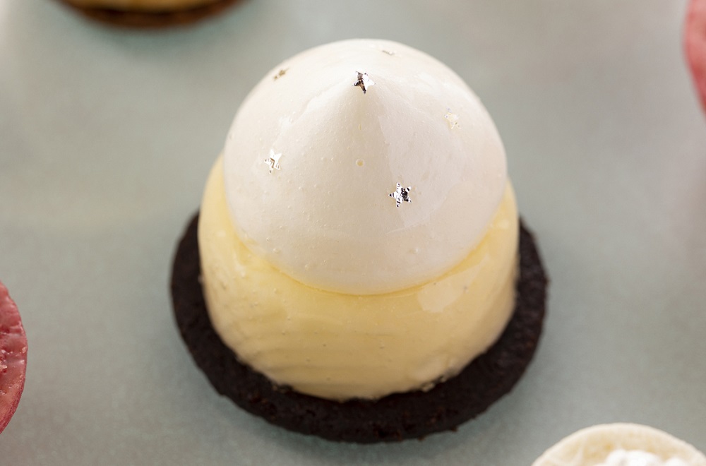 チョコレートサブレの上に紅茶のムースを載せ、上にルイボスティーのクリームを絞っています。小さなシルバーの星を飾り、「Stellaシリーズ」のグラマラスなジュエリーをイメージ。