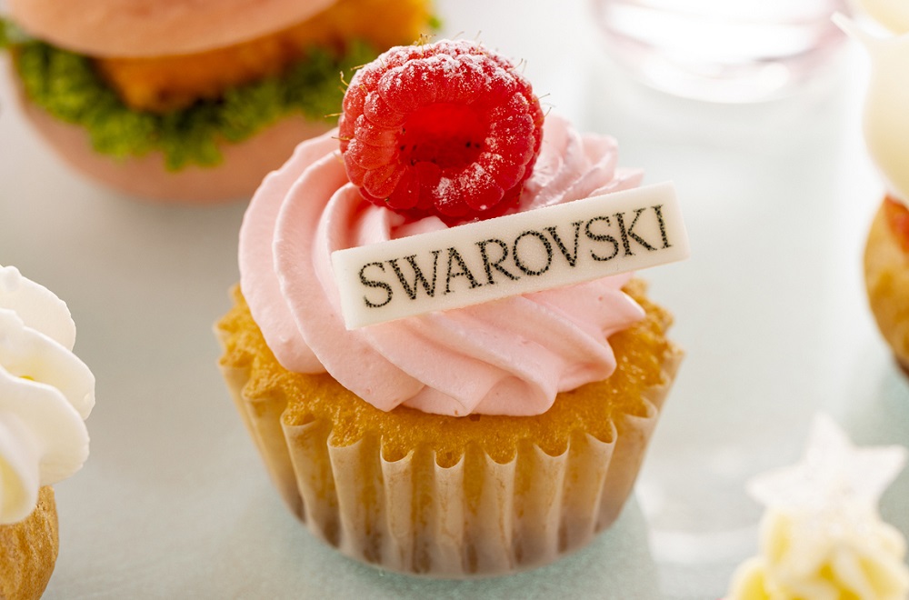 レモンとベルガモットのフレーバーのカップケーキにバラが香るクリームを絞り、フレッシュラズベリーをトッピング。仕上げにはSwarovskiのロゴが。