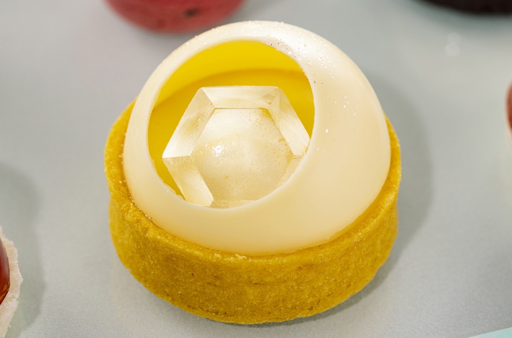 タルトの中にキャラメルオレンジクリームとスポンジを入れ、ホワイトチョコレートのガナッシュを流した一品。美しいカッティングを表現したエルダーフラワーのゼリーとホワイトチョコレートのドームで飾って。