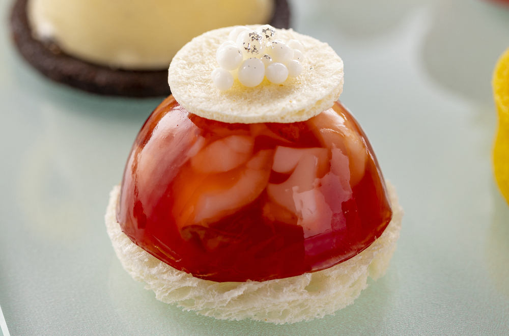 ピンクの色彩が可愛らしいいちごとバニラのパンナコッタの上にフレッシュいちごをあしらい、クリスタルのように輝くゼリーで閉じ込めた一品。シナモンの香りが華やかです。
