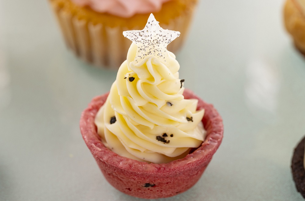 ビーツのタルトに、ポークリエットを詰め、ヘルシーなゴートチーズのムースをひと絞り。グリッターを纏った星を飾り、クリスマスツリーをイメージ。