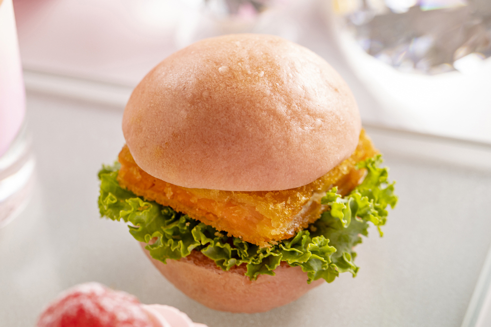 Swarovskiが生まれたオーストリアの代表料理シュニッツェルをサーモンのフライでアレンジ。タルタルソース、フリルレタスと一緒にビーツで可憐なピンク色に仕上げたバンズに挟んでバーガー仕立てに。