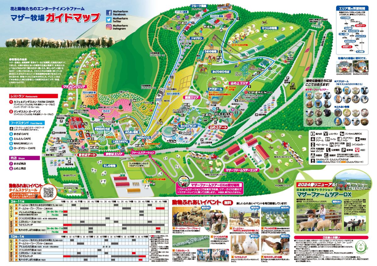 2025年春のガイドマップ。左下にイベントやショーのスケジュール表があります。